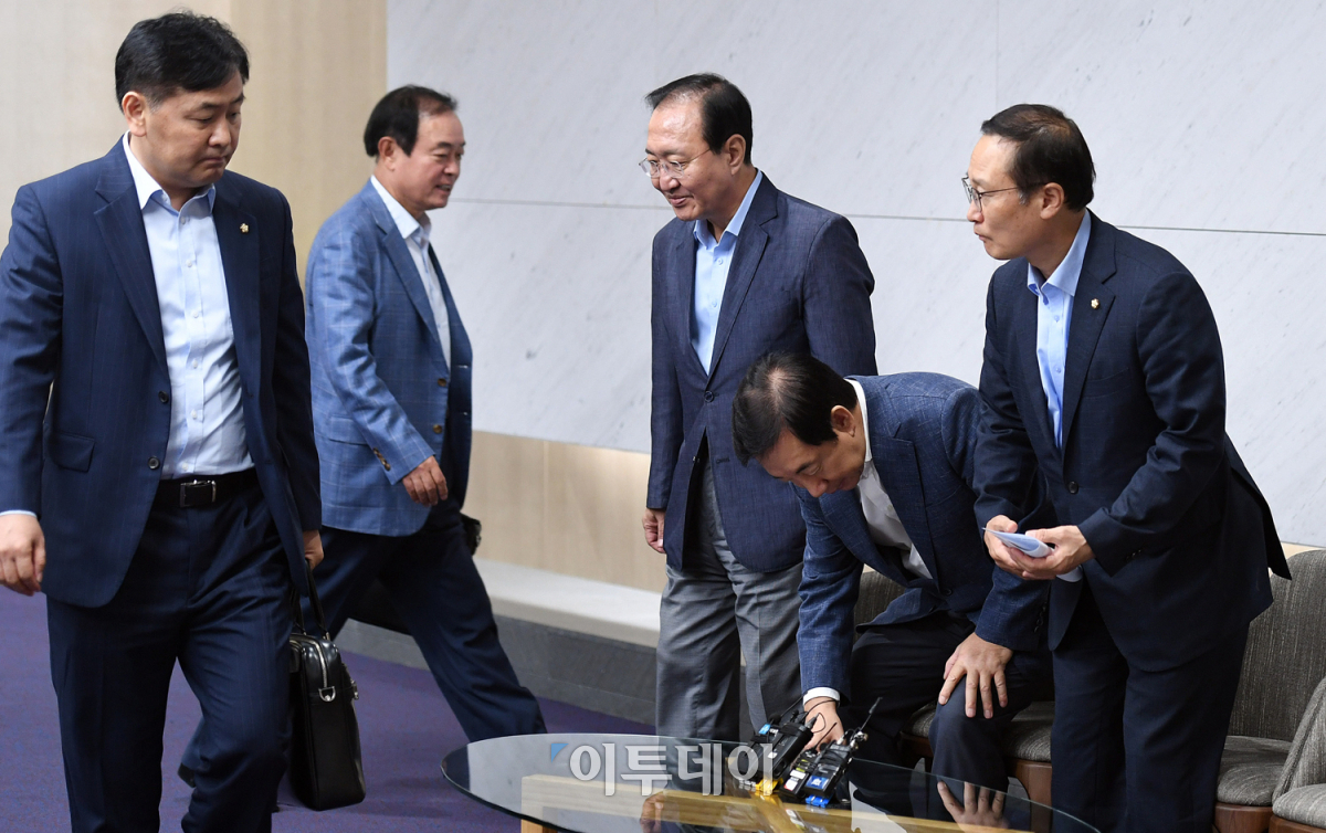 여야 5당 원내 사령탑이 4박6일 일정으로 미국을 방문해 초당적 외교 활동을 벌인다. (왼쪽부터)김관영 바른미래당, 노회찬 정의당, 장병완 민주평화당, 김성태 자유한국당, 홍영표 더불어민주당 원내대표가 18일 오전 인천국제공항 제2여객터미널 브리핑룸에서 출국 전 방미 목적 등을 설명하고 있다. 오승현 기자 story@