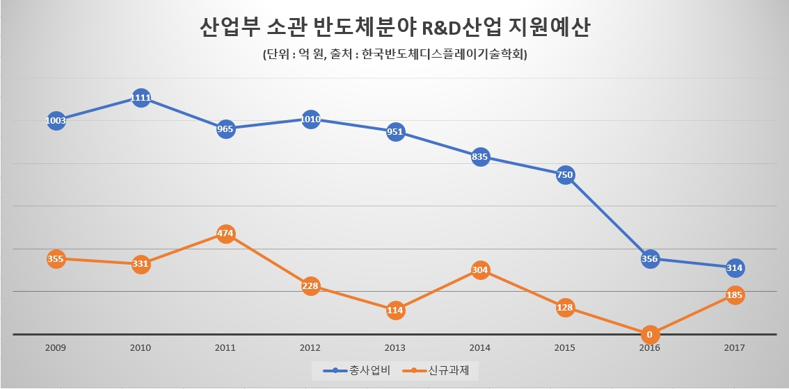 산업부 소관 반도체 분야 R&D 사업 지원 예산은 2009년 1003억 원에서 2017년 314억 원으로 감소했다. 8년 새 70% 가까이 줄어든 수치다. 신규과제 예산은 2009년 355억 원에서 2017년 185억 원으로 절반 가까이 깎였다. 심지어 2016년에는 신규과제 지원 예산이 ‘0원’을 기록하기도 했다.