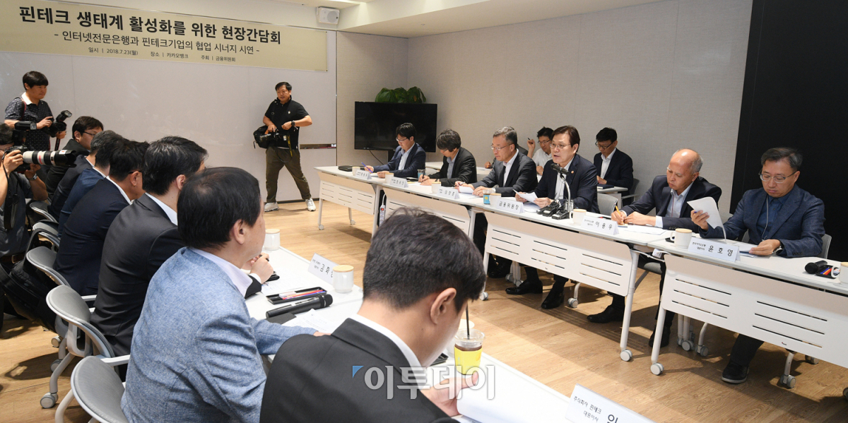 최종구 금융위원장이 23일 오전 경기도 성남시 분당구 카카오 판교오피스에서 열린 '핀테크 생태계 활성화를 위한 간담회'에 참석해 모두발언을 하고 있다. 이날 최 위원장은 카카오뱅크와 케이뱅크, 핀테크기업 간의 다양한 협업사례를 청취하고, 의견을 나눴다. 오승현 기자 story@