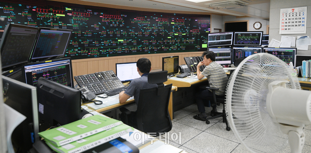 연일 이어지는 기록적인 폭염에 냉방기 사용 증가로 전력수요가 급증하고 있다. 절기상 '대서'이자 전국 대부분 지역에 2주째 폭염특보가 내려진 23일 경기도 수원시 한국전력공사 경기지역본부 전력관리처 관계자들이 선풍기로 더위를 버티며 전력수급 현황을 예의주시하고 있다. 전력관리처 한 관계자는 "최근 전력사용이 급증하는 오후 시간대에 평균 예비전력율은 10%에서 11% 수준을 보인다"고 말했다. 오승현 기자 story@