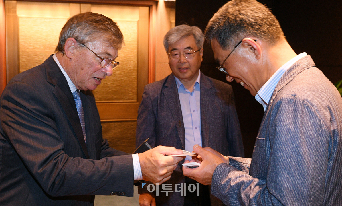 '토마스 코칸(Thomas A. Kochan·왼쪽) 미국 매사추세츠공대(MIT) 교수 초청 한국노총 간담회'가 열린 24일 오전 서울 강남구 인터컨티넨탈 서울 파라나스에서 코칸 교수와 김주영 한국노총 위원장이 인사를 나누고 있다. '국제노동고용학회(ILERA) 2018 서울 세계대회' 참석차 방한한 코칸 교수는 ILERA 9대 회장을 역임했다. 오승현 기자 story@