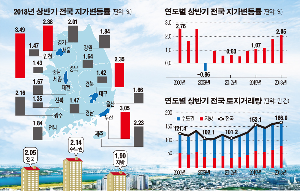 우선 시도별(%)로 보면 17개 시‧도의 땅값이 모두 올랐으며 세종(3.49), 부산(3.05), 서울(2.38), 대구(2.35), 제주(2.23) 순으로 높게 상승했다.