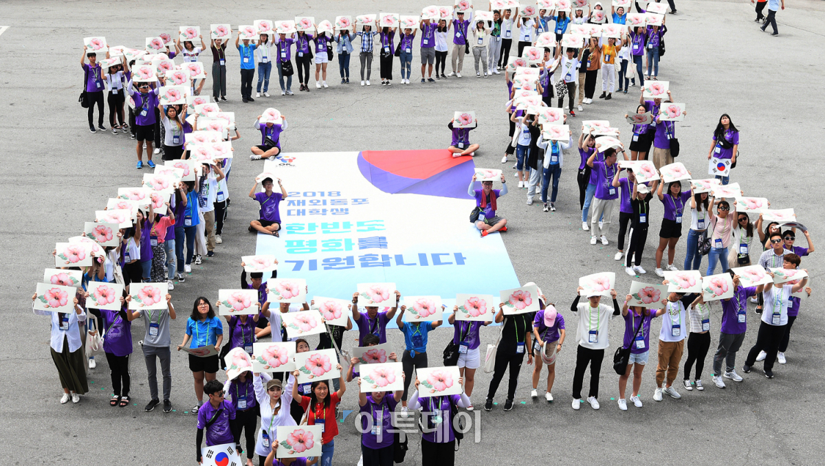 한국전쟁 정전협정 체결 65주년을 이틀 앞둔 25일 경기도 파주시 임진각 망배단에서 '2018 재외동포 대학생 모국연수'에 참가한 세계 각국 재외동포 및 국내 대학생 150여 명이 한반도와 세계평화를 기원하며 대형 한반도를 만들고 있다. '2018 재외동포 대학생 모국연수'는 재외동포재단이 주최했다. 오승현 기자 story@