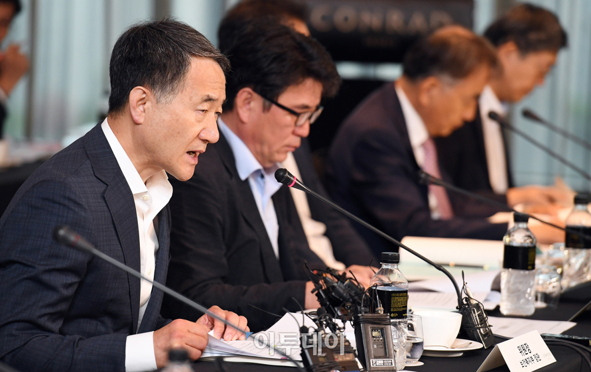 박능후 보건복지부 장관이 26일 오전 서울 여의도 콘래드서울호텔에서 열린 '2018년도 제5차 국민연금기금운용위원회'를 주재하고 있다.이날 위원회에서 위원들은 '국민연금기금 스튜어드십 코드'(국민연금이 투자한 기업에 대한 의결권 행사 기준) 도입 방안 등을 의결했다. 오승현 기자 story@