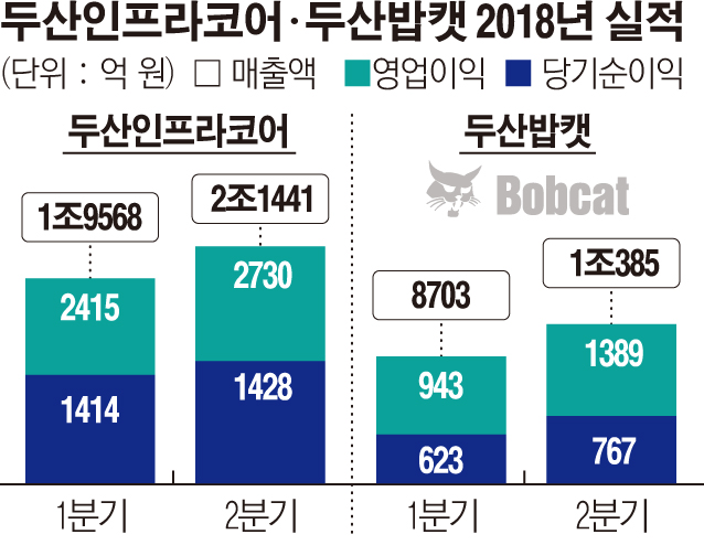 두산인프라코어의 자회사로 로더와 미니 굴삭기 등 소형 건설장비를 생산하는 두산밥캣도 2분기 실적 개선에 성공했다. 두산밥캣은 연결재무제표 기준 2분기 영업이익 1389억 원을 기록했다. 이는 전 분기 대비 47.2%, 전년 동기 대비 10.8% 증가한 수치다.