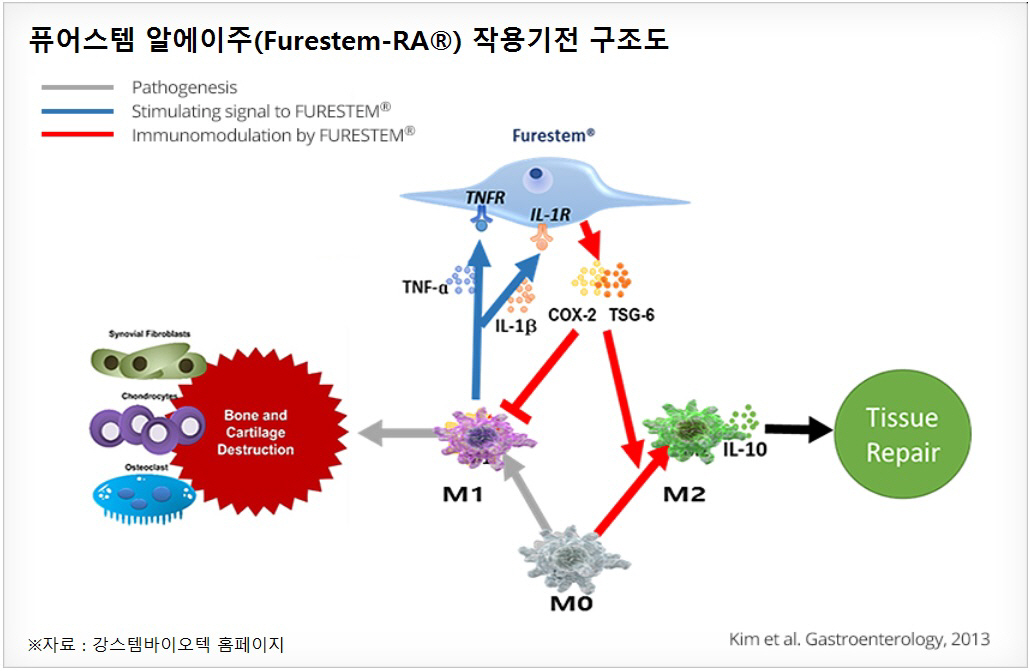 주목할 대목은 대형 제약사의 제품들과 경쟁이 가능하다는 점이다. 회사 측에 따르면 류머티즘 관절염을 일으키는 물질은 ‘TNF-α’와 ‘IL-1β’로 알려졌다. 강스템바이오텍의 퓨어스템알에이주는 몸 안에서 ‘TNF-α’가 과다하다고 스스로 판단하면 반대 물질인 ‘PGE2’와 ‘TSG-6’를 발현한다. 애브비의 휴미라, 존슨앤존슨의 레미케이드도 ‘TNF-α’를 억제하는 항체 신약이다.
