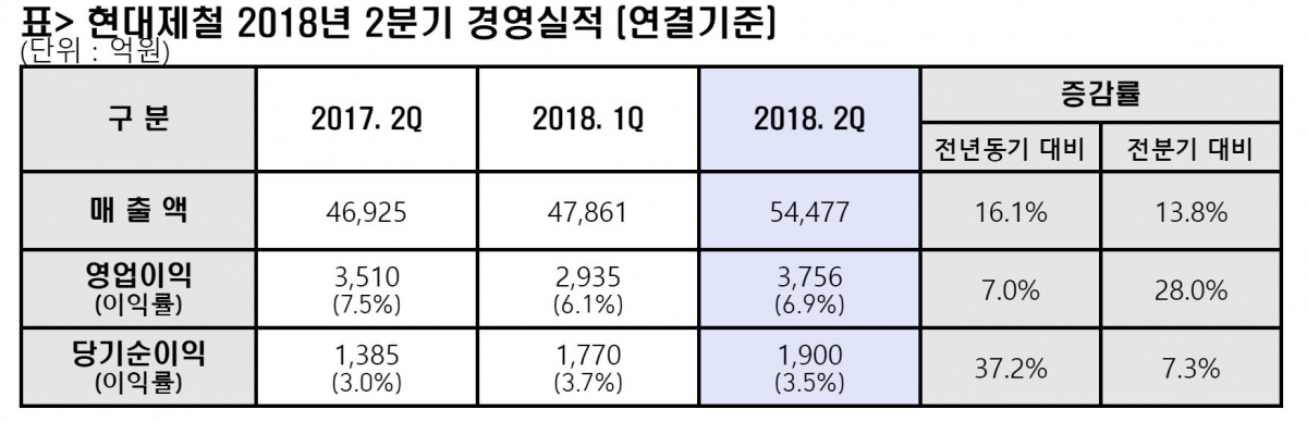 현대제철은 2018년 2분기 연결기준 영업이익이 전년 동기 대비 7% 증가한 3756억 원이라고 27일 밝혔다. 같은 기간 매출액은 전년 동기 대비 16.1% 증가한 5조4477억 원을 기록했지만, 영업이익률은 0.6% 축소된 6.9%를 나타냈다.