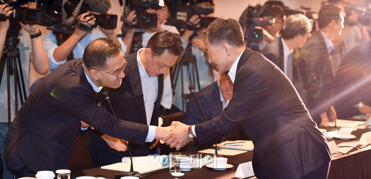 국민연금 기금운용위원회가 '경영참여' 포함 여부를 두고 위원간 이견을 보이며 결론을 내리지 못했던 '스튜어드십코드'(기관투자자의 의결권 행사 지침) 도입 안건을 심의·의결하기 위해 다시 머리를 맞댔다. 박능후(오른쪽) 보건복지부 장관이 30일 오전 서울 중구 더플라자호텔에서 열린 '2018년도 제6차 국민연금 기금운용위원회'에 입장하며 위원들과 인사를 나누고 있다. 오승현 기자 story@