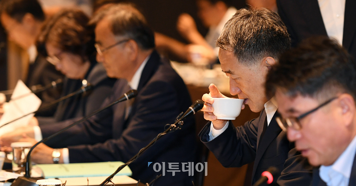국민연금 기금운용위원회가 '경영참여' 포함 여부를 두고 위원간 이견을 보이며 결론을 내리지 못했던 '스튜어드십코드'(기관투자자의 의결권 행사 지침) 도입 안건을 심의·의결하기 위해 다시 머리를 맞댔다. 박능후 보건복지부 장관이 30일 오전 서울 중구 더플라자호텔에서 열린 '2018년도 제6차 국민연금 기금운용위원회'에서 모두발언에 앞서 물을 마시고 있다. 오승현 기자 story@