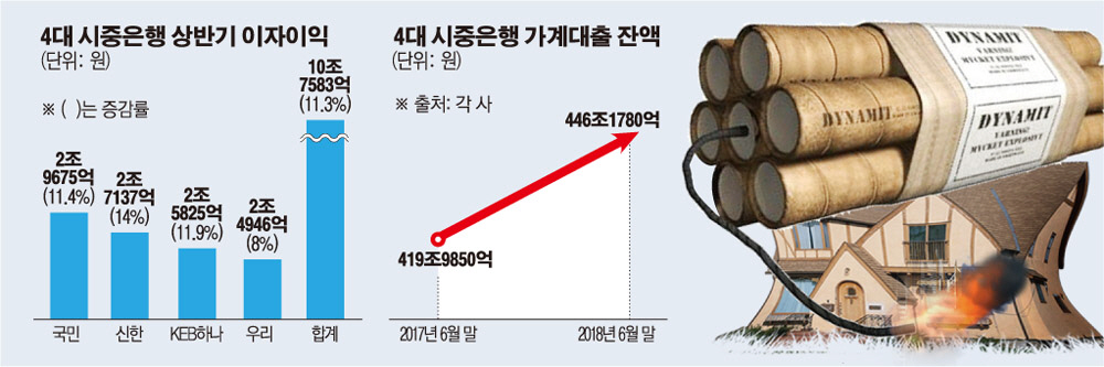 문제는 은행 대출 가운데 유난히 가계대출 비중이 증가하고 있다는 것이다. 4대 시중은행의 올 상반기 가계대출 잔액은 446조1780억 원으로 지난해 상반기(419조9850억 원)보다 26조1930억 원 증가했다. 지난해 말 기준 국내 은행의 원화 대출금 중 가계대출 비중은 43.8%로 2008년 이후 연평균 증가율은 6.2%로 기업대출 5.4%보다 높았다.