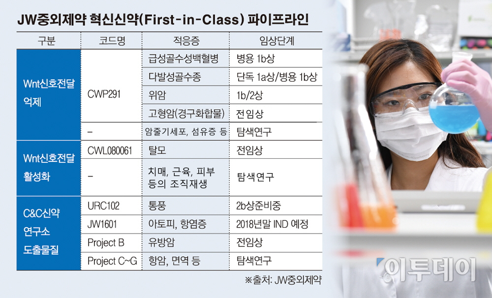 JW중외제약은 Wnt 신호전달 분야에 특화된 화합물 라이브러리를 통해 혁신 신약 파이프라인을 구축했다. 2000년대 초반부터 Wnt 분야에 관한 연구를 통해 수만여 종류의 화합물 라이브러리인 ‘쥬어리(JWELRY)’와 Wnt 신호전달 경로의 활성 및 저해를 구별할 수 있는 독창적인 스크리닝 시스템(화합물 유효성 예측)을 원천기술로 보유하고 있다. Wnt는 세포의 증식과 재생을 조절하는 신호전달 단백질이다. Wnt 신호를 억제하면 항암제를, 증폭하면 치매나 탈모, 퇴행성관절염 등 세포 노화나 퇴화와 관련한 질병 치료제를 개발할 수 있다.