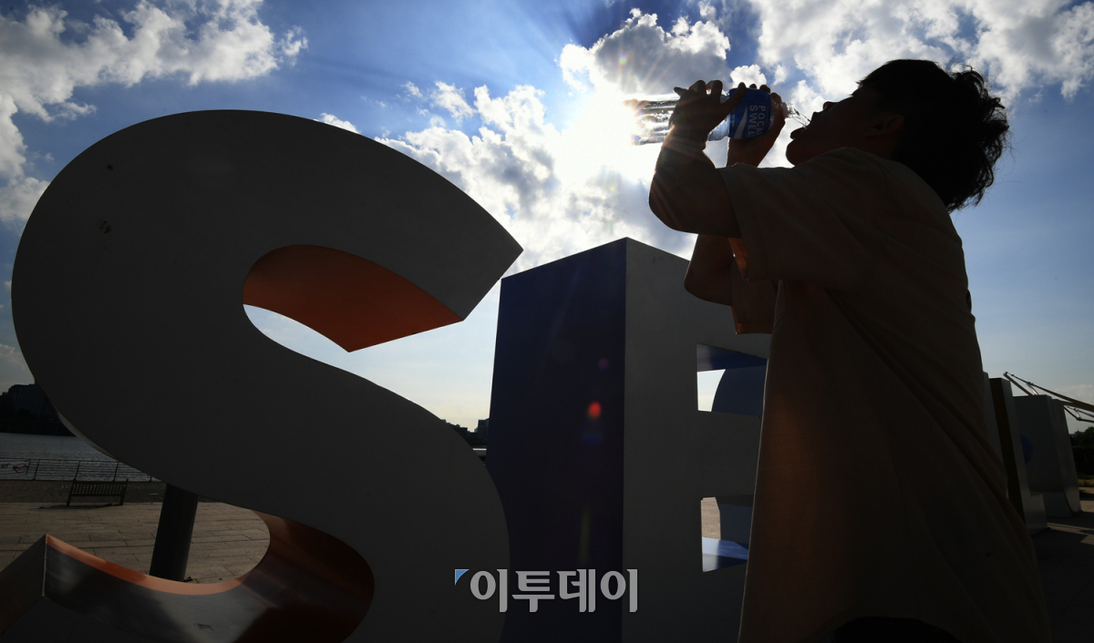 기상 관측 111년 만에 최악의 폭염이 찾아오며 지금보다 더 더워질 것으로 보인다. 서울을 비롯한 중부 지방의 더위체감지수가 '매우 위험' 단계까지 치솟은 31일 오전 서울 여의도 한강공원에서 아침 운동을 나온 한 학생이 작열하는 태양 아래서 물을 마시고 있다. 한편, 다음 달 1일과 2일은 서울의 낮 최고 기온이 39℃까지 치솟으며 지난 1994년 38.4℃ 기록을 뛰어넘을 것으로 예보됐다. 오승현 기자 story@