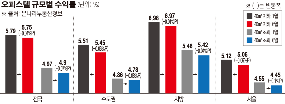 1일 온나라부동산정보에 따르면 6월 기준 서울의 40㎡이하 오피스텔 수익률은 5.06%, 40㎡초과 수익률은 4.45%로 각각 나타났다. 올해 1월과 비교하면 순서대로 0.06%포인트, 0.1%포인트 떨어진 수치다.