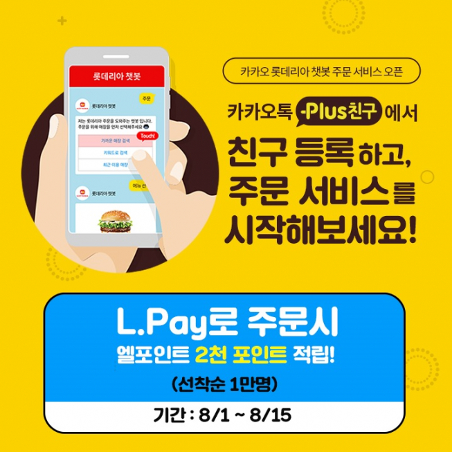 롯데GRS는 '카카오톡 챗봇 주문 서비스'를 전국 롯데리아 1007개, 엔제리너스커피 504개 매장에서 주문이 가능하고, 오는 15일까지 L.pay로 주문 시 선착순 1만명에게 2000 포인트 적립 이벤트도 함께 진행한다.