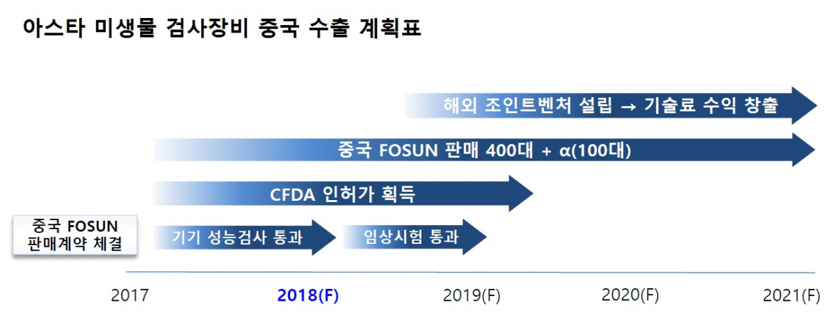 아스타는 올해 초 중국 파트너 포선(Shanghai Fosun Long March Medical Science)와 판매 계약을 체결했다. 양사는 지난해 4분기부터 CFDA 기기 성능 테스트를 진행했고 올 5월 검사를 통과했다.