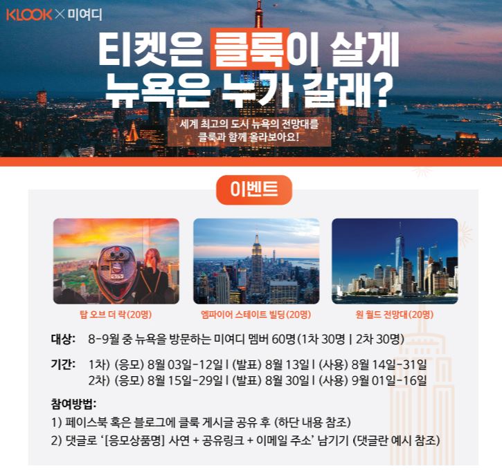 해당 이벤트는 8~9월 중 뉴욕을 방문하는 '미여디 회원'에게 해당된다. 응모 방법은 페이스북 혹은 블로그에 클룩 게시글을 공유 후, 미여디 내 이벤트 페이지에 댓글로 인증하면 된다. 1,2차에 나눠서 진행되는 이번 이벤트는 오는 29일까지 진행되며, 총 60명에게 뉴욕 최고의 전망대 3곳을 탐방할 수 있는 기회가 주어진다.
