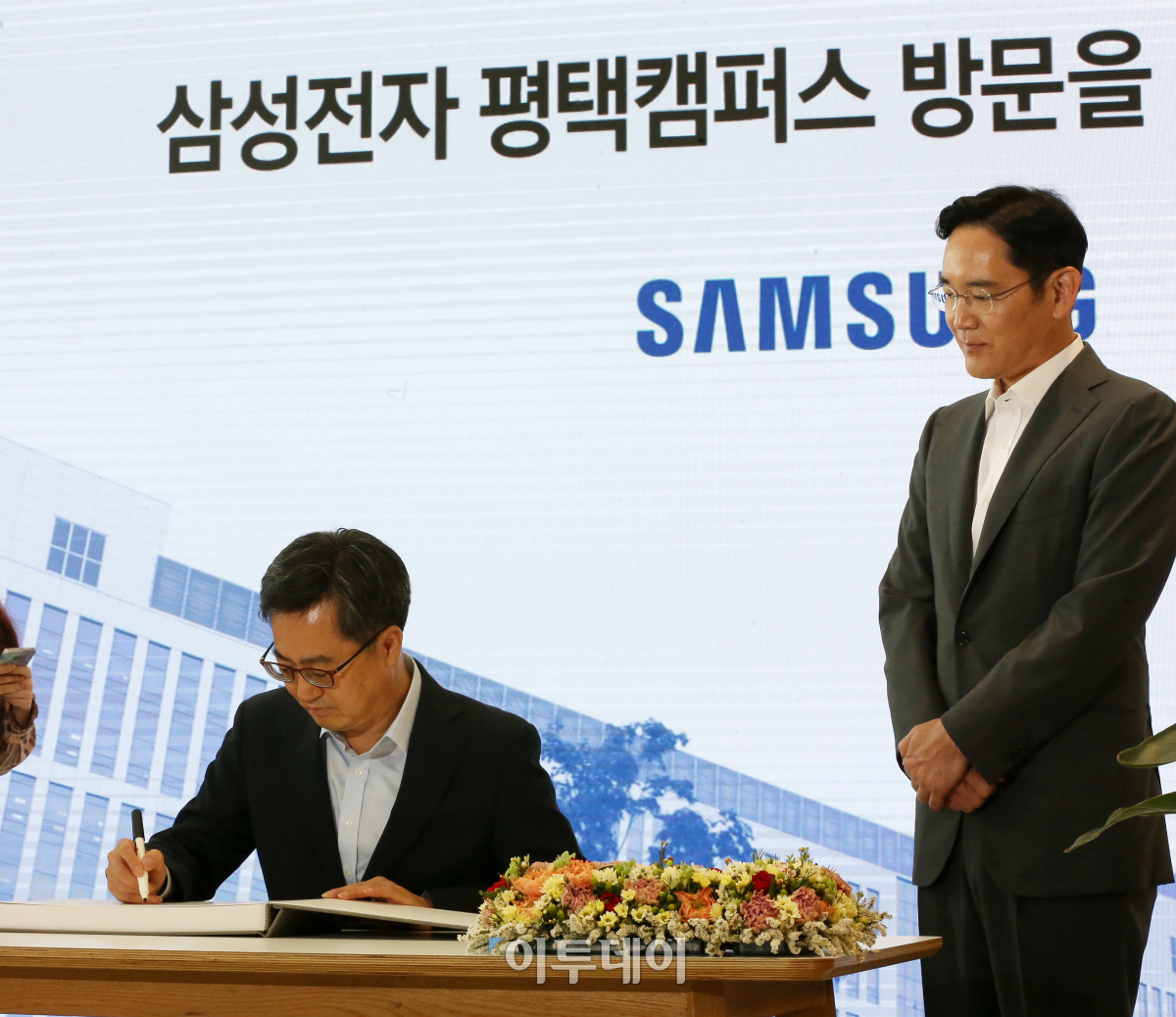 김동연 경제부총리 겸 기획재정부 장관이 6일 오전 삼성전자 평택캠퍼스를 방문해 이재용 삼성전자 부회장과 만나 방명록을 작성하고 있다. 고이란 기자 photoeran@
