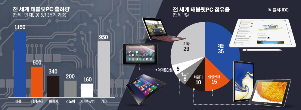 한편, 애플과 화웨이는 태블릿PC 시장 위축에도 소폭 증가세를 보였다. 애플은 올해 2분기 태블릿PC 출하량이 전년 동기 대비 10만 대 늘어난 1150만 대로 1위를 차지했다. 시장점유율은 지난해 2분기 29.9%에서 올해 2분기 34.9%로 늘었다. 3위 자리에 오른 화웨이도 지난해 2분기 출하량 310만 대에서 올해 340만 대로 소폭 증가세를 보였다. 시장점유율은 8.2%에서 10.3%로 증가했다.