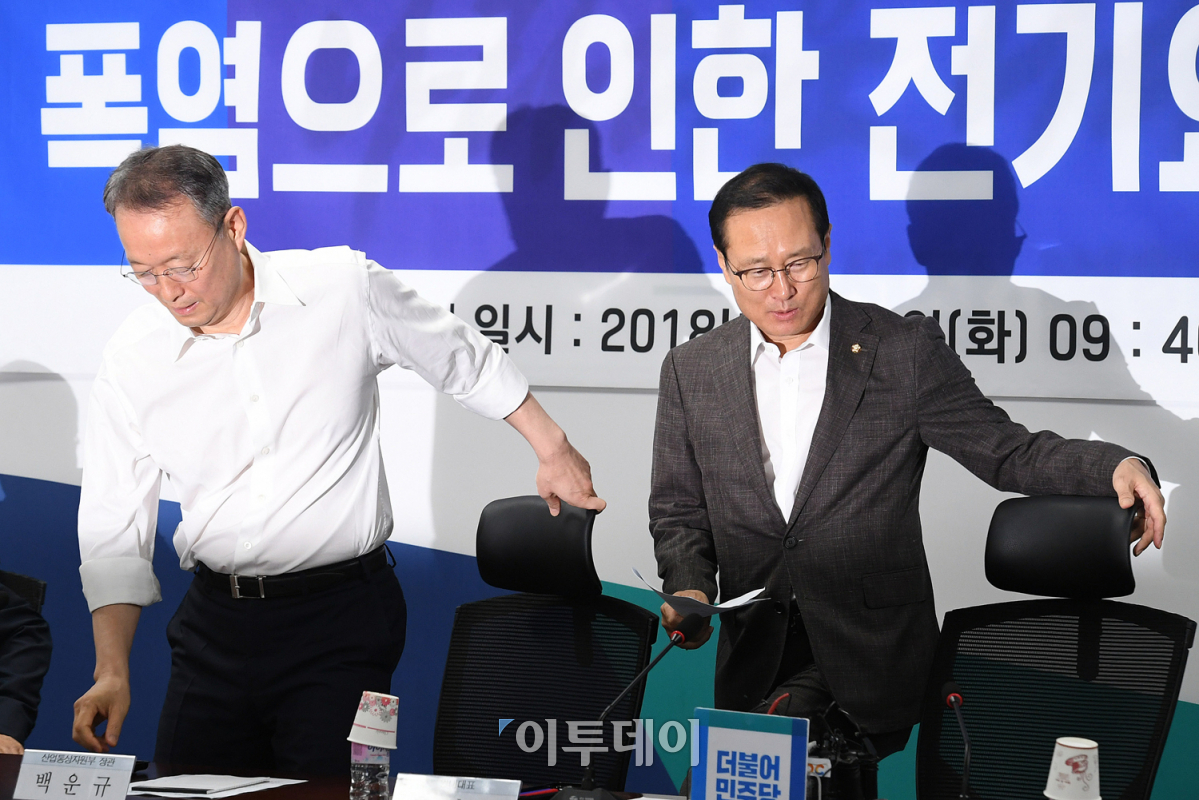 정부와 여당이 문재인 대통령의 '주택용 전기요금 누진제 한시적 완화 지시'에 대한 세부사항을 논의했다. 더불어민주당 홍영표 원내대표와 백운규 산업통상자원부 장관이 7일 오전 서울 여의도 국회의원회관에서 열린 '폭염으로 인한 전기요금 지원대책 당정협의'에 참석하고 있다. 오승현 기자 story@