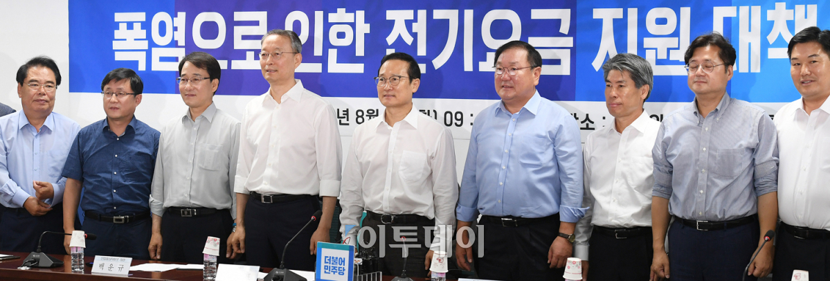 정부와 여당이 문재인 대통령의 '주택용 전기요금 누진제 한시적 완화 지시'에 대한 세부사항을 논의했다. 더불어민주당 홍영표 원내대표, 김태년 정책위의장을 비롯한 여당 인사와 백운규 산업통상자원부 장관 등 참석자들이 7일 오전 서울 여의도 국회의원회관에서 열린 '폭염으로 인한 전기요금 지원대책 당정협의'에 앞서 기념사진을 촬영하고 있다. 오승현 기자 story@