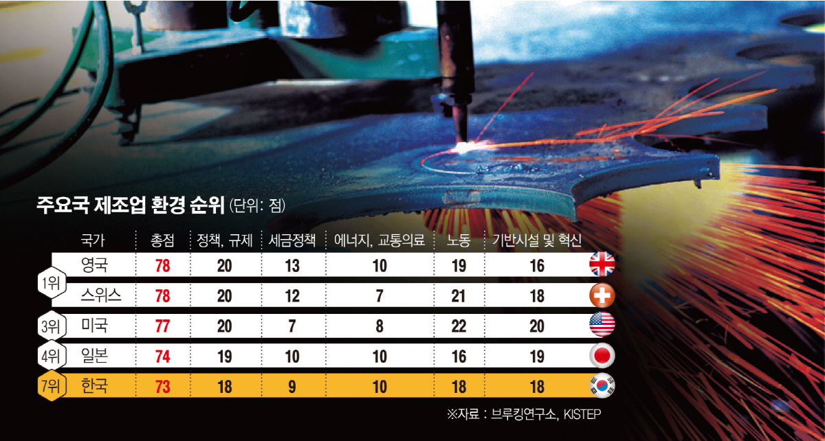 제조업에서 우리나라의 강점은 기반시설·혁신, 노동력이 꼽혔다. 한국은 기반시설·혁신이 25점 중 18점으로 프랑스, 스위스, 중국과 함께 공동 4위를 차지했다. 노동력도 25점 중 18점으로 네덜란드와 공동 5위였다.
