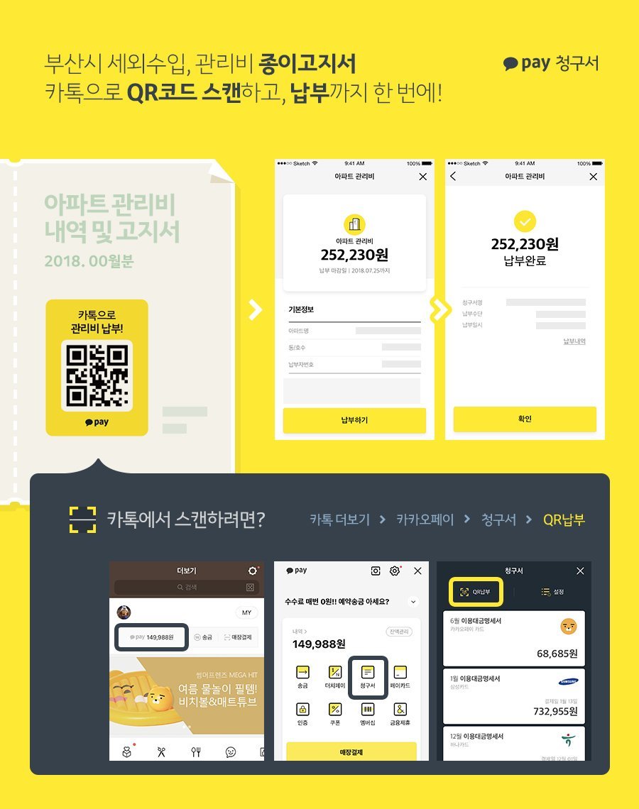 이에 앞서 카카오페이는 지난달부터 부산시 소재의 아파트 관리비도 ‘카카오페이 청구서’를 통해 QR납부 할 수 있는 서비스도 시행하고 있다. 앞으로는 신용카드로도 결제할 수 있도록 납부 수단을 확대할 예정이다. 아파트 관리비 QR납부 서비스는 부산뿐만 아니라 울산, 경주, 포항, 경남 지역 및 제주에서도 제공하고 있다.