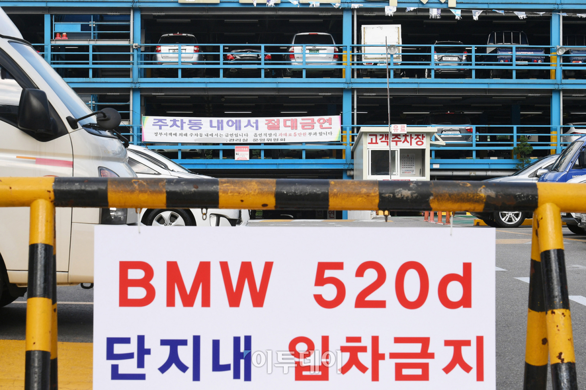 최근 BMW 차량의 잇따른 화재사고로 시내 곳곳에 BMW 차량 임시 주차구역이 생긴 데 이어 리콜 대상 차량의 출입이 통제된 중고차 매매단지가 등장했다. 8일 오전 경기도 부천시 한 중고차 매매단지 입구에 '재산 보호를 위해 BMW 520d 차량의 전시장 입차를 금한다'는 내용의 현수막과 안내판이 설치돼 있다. 오승현 기자 story@