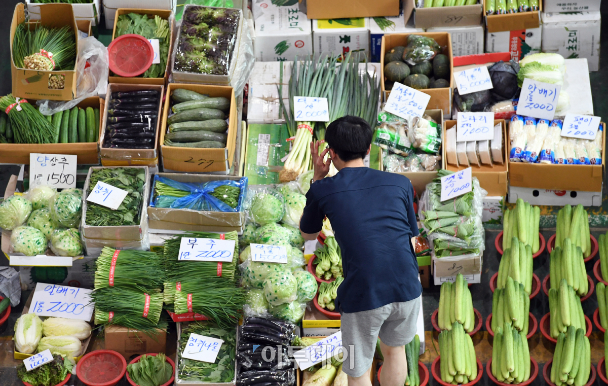 사상 최악의 폭염으로 채솟값이 연일 고공행진 하며 식탁물가에 비상이 걸렸다. 한국소비자원 가격정보사이트 참가격에 따르면 양배추가 한 주 새 41.2%, 시금치 33.4% 등 채솟값이 1주 전보다 5.4% 올랐으며 수산가공품은 7.0%, 생선류는 2.4% 각각 상승했다. 8일 경기도 부천시 삼산농산물도매시장에서 소비자들이 채소 구매를 망설이고 있다. 오승현 기자 story@
