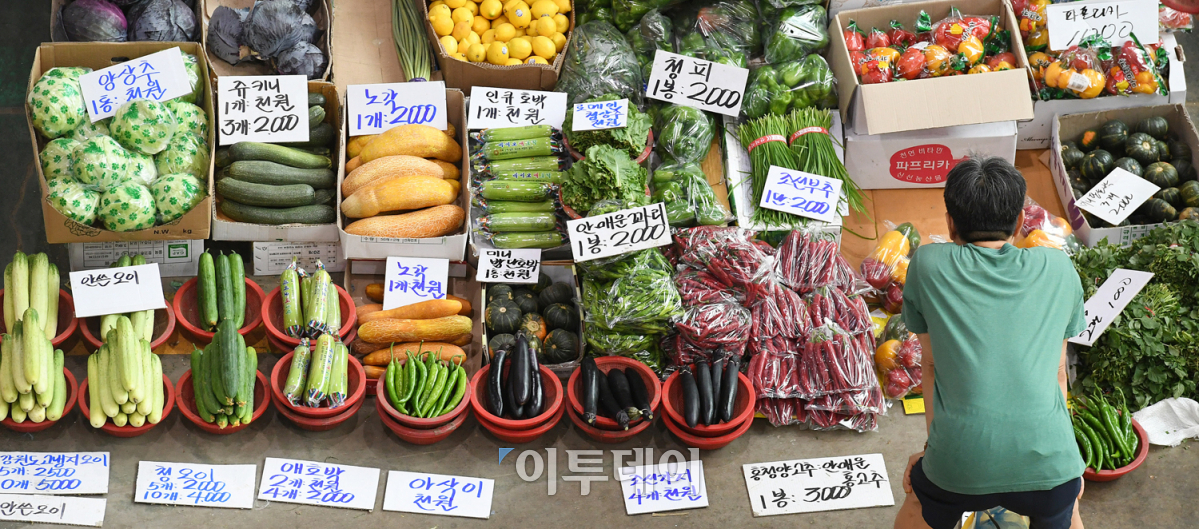사상 최악의 폭염으로 채솟값이 연일 고공행진 하며 식탁물가에 비상이 걸렸다. 한국소비자원 가격정보사이트 참가격에 따르면 양배추가 한 주 새 41.2%, 시금치 33.4% 등 채솟값이 1주 전보다 5.4% 올랐으며 수산가공품은 7.0%, 생선류는 2.4% 각각 상승했다. 8일 경기도 부천시 삼산농산물도매시장에서 소비자들이 채소 구매를 망설이고 있다. 오승현 기자 story@