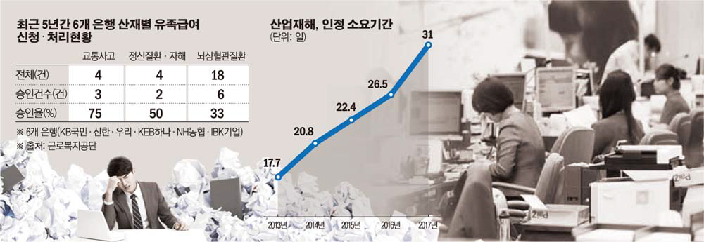 더군다나 은행은 그동안 ‘포괄임금제’에 묶여 있어 산재 판단 근거인 근로시간을 제대로 산정하기 어려웠다. 포괄임금제는 연장·야간근무 등 시간 외 근무수당을 일괄적으로 급여에 포함하는 제도다. 초과근무시간을 정확히 세지 않고, 뭉뚱그려 수당을 주는 방식이다. 그나마 최근 ‘주 52시간제’ 도입과 포괄임금제를 보는 엄격해진 법원 잣대 덕에 많이 사라지고 있는 추세라고 한다.