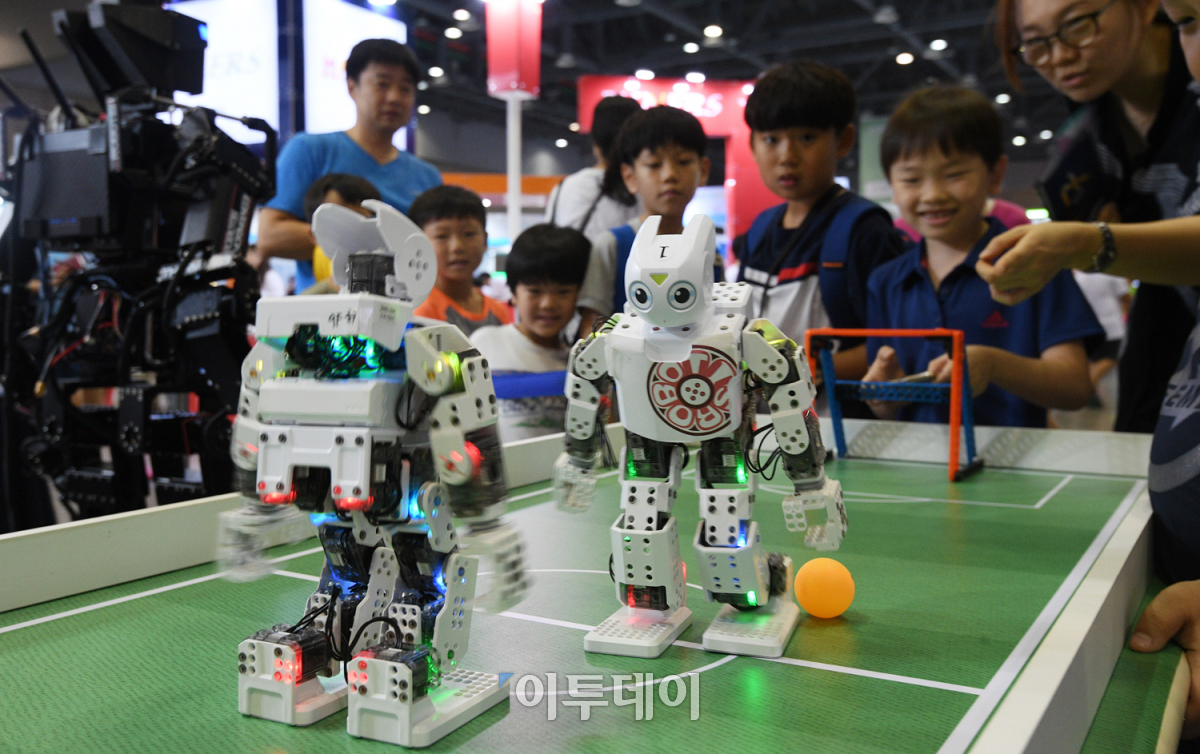 게임과 놀이, 전시를 통해 과학을 즐길 수 있는 '2018 대한민국과학창의축전'이 개막한 9일 경기도 고양시 킨텍스에서 어린이들이 로봇 축구를 즐기고 있다. 과기정통부가 주최하고 한국과학창의재단이 주관한 이번 행사는 오는 12일까지 계속된다. 오승현 기자 story@