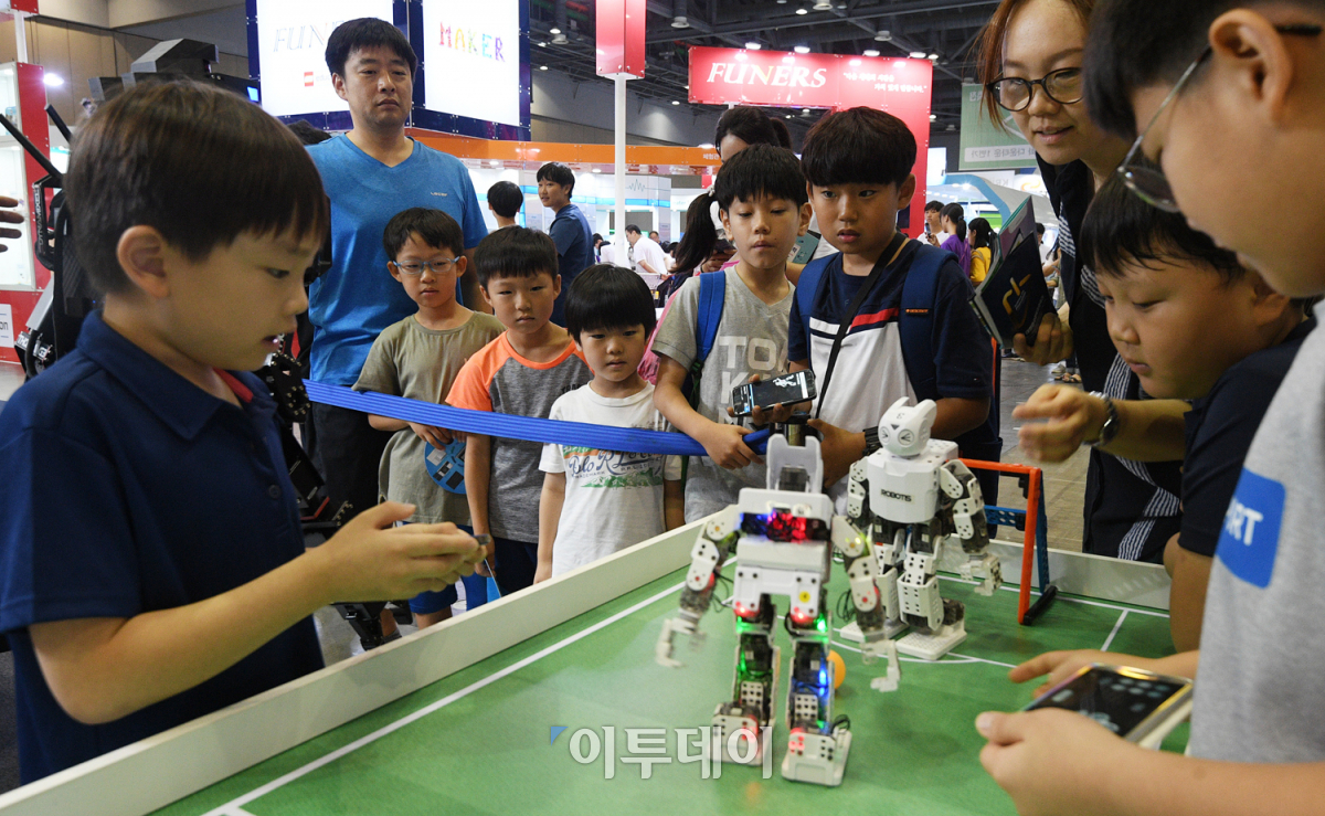 게임과 놀이, 전시를 통해 과학을 즐길 수 있는 '2018 대한민국과학창의축전'이 개막한 9일 경기도 고양시 킨텍스에서 어린이들이 로봇 축구를 즐기고 있다. 과기정통부가 주최하고 한국과학창의재단이 주관한 이번 행사는 오는 12일까지 계속된다. 오승현 기자 story@
