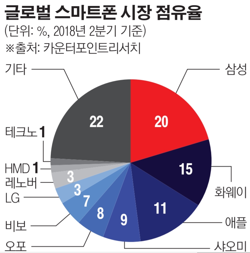 삼성과 화웨이의 올 2분기 시장점유율 차이는 5%포인트 남짓. 지난해 같은 기간 삼성(점유율 22%)과 화웨이(11%)의 점유율 차이는 10%포인트였다. 1년 사이에 점유율 격차를 절반 줄이며 따라붙었다. 삼성은 올해 2분기 7160만 대의 스마트폰을 판매하며 시장 점유율 20%로 1위 자리를 지켰다. 점유율은 2%포인트 소폭 하락했지만, 판매량은 전년 동기 대비 11% 감소했다.