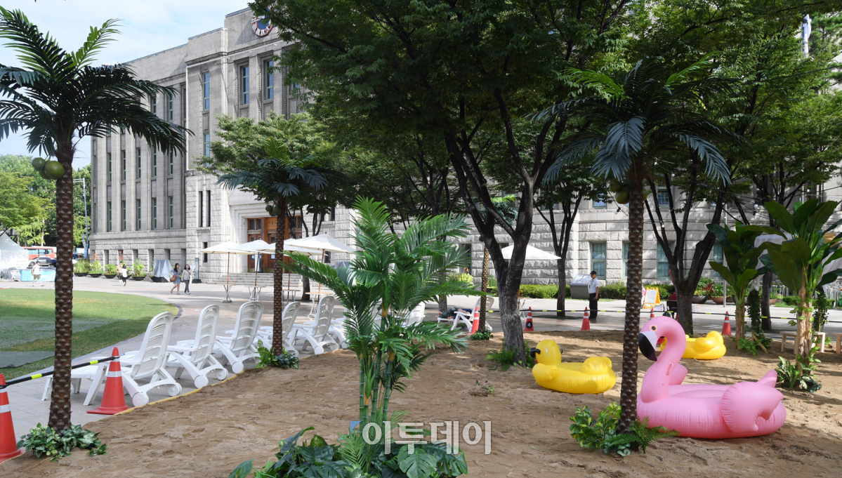 '서울 문화로 바캉스'가 개장한 10일 오전 서울 중구 서울광장에 미니 해변이 조성돼 있다. 서울시는 프랑스 파리 센강에서 매년 개최되는 '파리 플라주'를 본떠 이번 행사를 마련했으며, 실제 해변에서 15t의 모래를 옮겨와 해수욕장을 연출했다. 오승현 기자 story@