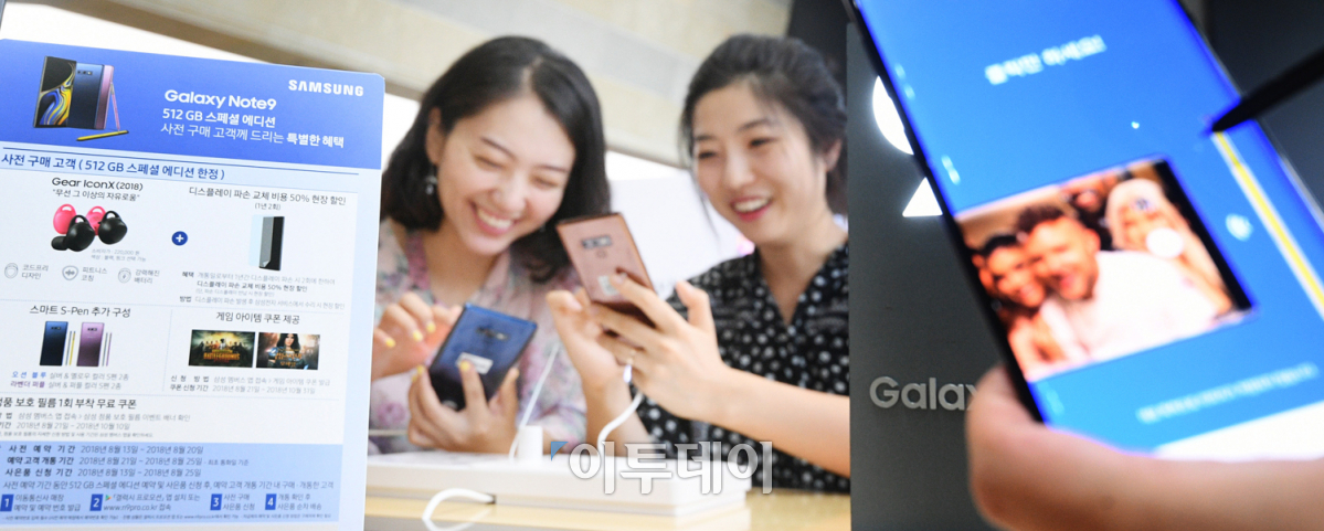 삼성전자 플래그십 모델 '갤럭시 노트9'의 사전예약이 시작된 13일 오전 서울 세종로 KT스퀘어에서 소비자들이 제품을 살펴보고 있다. '갤럭시 노트9'의 사전예약은 삼성전자 및 이동통신 3사 온·오프라인 매장에서 오는 20일까지 진행되며, 정식 출시일은 24일이다. 오승현 기자 story@