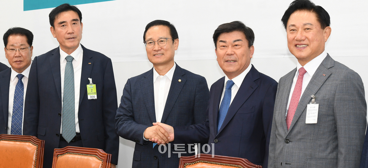 중소기업중앙회가 국회를 찾아 일자리 창출과 기업투자 활성화, 소상공인 및 자영업자를 위한 정책을 제언했다. 박성택 중기중앙회장과 홍영표 더불어민주당 원내대표가 14일 서울 여의도 국회에서 만나 악수하고 있다. 이날 박 회장은 홍 원내대표를 비롯해 김병준 자유한국당 비상대책위원장과 김관영 바른미래당 원내대표를 각각 만나 고용안정 및 인력난 해소방안 등을 논의했다. 오승현 기자 story@