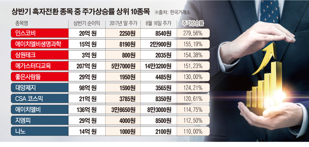 양 시장을 통틀어 해당 기간 주가상승률이 가장 높았던 종목은 인스코비(279.56%)다. 이외에 △에이치엘비생명과학(155.19%) △삼원테크(154.38%) △메가스터디교육(151.23%) △좋은사람들(130.00%) △대양제지(124.21%) △CSA 코스믹(120.61%) 순으로 주가상승률이 높았다.