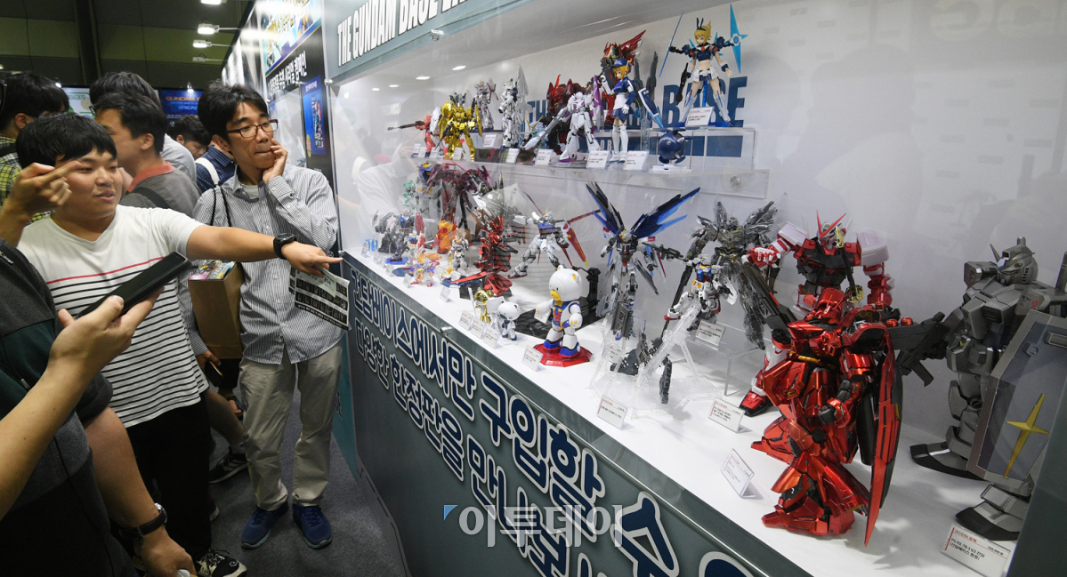 건담과 건프라 마니아들의 축제 '건프라 엑스포 KOREA 2018'이 개막한 16일 서울 강남구 코엑스에서 마니아를 비롯한 관람객들이 다양한 프라모델을 살펴보고 있다. 오승현 기자 story@