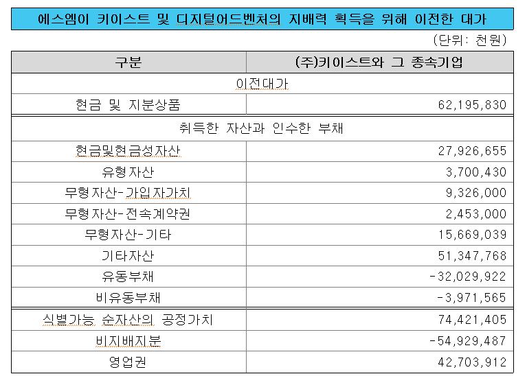 금융감독원 전자공시시스템에 따르면 에스엠이 키이스트와 디지털어드벤처의 지배력을 획득하기 위해 책정한 인수 가치는 621억 원이다. 키이스트와 디지털어드벤처의 순자산 공정가치(식별 가능한 순자산) 744억 원에서 비지배지분(제3자의 지분) 549억 원을 제외하고, 영업권 427억 원을 더한 금액이다.