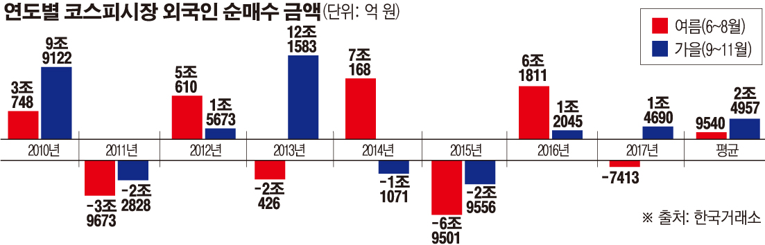 2010년부터 지난해까지 8년 동안 외국인의 여름 평균 순매수금액은 9540억 원에 불과했다. 순매도를 기록한 경우는 2011년(3조9673억 원), 2013년(2조426억 원), 2015년(6조9501억 원), 2017년(7413억 원) 등 4년이다.
