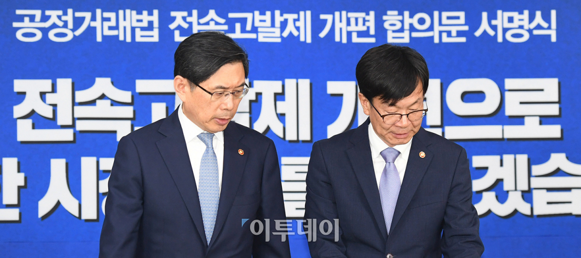 공정거래위원회의 고발이 있어야만 검찰이 수사할 수 있던 공정거래법 전속고발권이 부분 폐지된다. '공정거래법 전속고발제 개편 합의문 서명식'이 열린 21일 오전 서울 세종로 정부서울청사에서 김상조(오른쪽) 공정위원장과 박상기 법무부 장관이 서명식장으로 입장하고 있다. 오승현 기자 story@