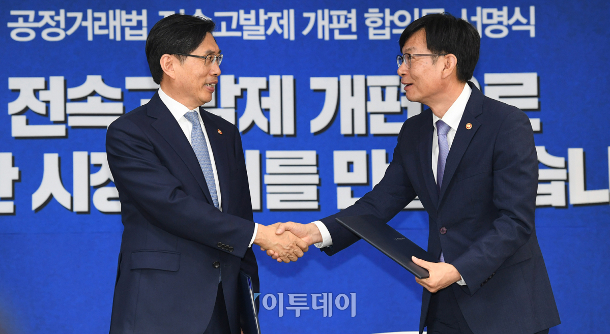 공정거래위원회의 고발이 있어야만 검찰이 수사할 수 있던 공정거래법 전속고발권이 부분 폐지된다. '공정거래법 전속고발제 개편 합의문 서명식'이 열린 21일 오전 서울 세종로 정부서울청사에서 김상조(오른쪽) 공정위원장과 박상기 법무부 장관이 합의문을 교환하고 있다. 오승현 기자 story@