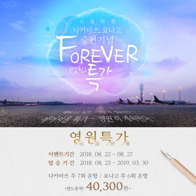 에어서울의 파격 특가는 계속된다는 의미의 ‘Forever(영원특가)’는 이번에는 일본 다카마쓰와 요나고 노선 증편 기념으로 각 노선당 2000석씩 총 4000매가 오픈된다.