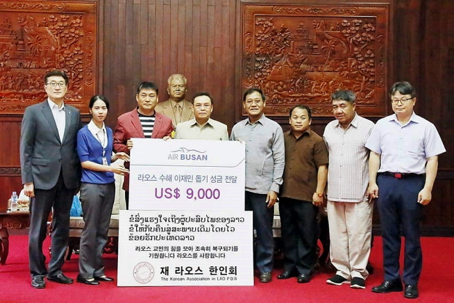 에어부산은 라오스 현지 비엔티안 지점장을 통해 이날 정우상 재라오스 한인회장과 함께 라오스 국가건설전선위원회 사이손폰 폼위한 의장(前 라오스 국회부의장)을 만나 깊은 위로의 뜻과 함께 구호성금을 전달했다.