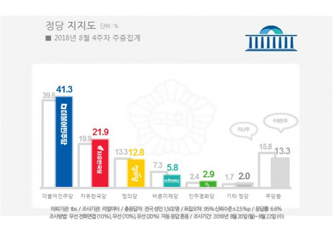제1야당인 한국당의 지지율은 전주 대비 2.0%p 오른 21.9%로 3주째 상승세를 지속했다. 한국당의 지지율이 20%대로 올라선 것은 6·13 지방선거가 진행 중이었던 지난 4월 4주차(21.1%) 이후 약 4개월 만의 일이다. 한국당 지지율은 TK와 호남, 충청권, 20대와 30대, 40대, 보수층에서 주로 상승했고, PK와 50대에서 하락한 것으로 조사됐다.