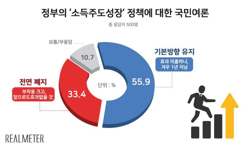 여론조사 전문기관 리얼미터는 23일 tbs 의뢰로 정부의 소득주도성장 정책에 대한 국민여론을 조사한 결과 ‘효과는 미흡하지만 겨우 1년 지났으므로 기본방향을 유지해야 한다’는 ‘기본방향 유지’ 응답이 55.9%로 집계됐다고 밝혔다. 반면 ‘부작용이 크고 앞으로도 효과가 없을 것이므로 전면 폐지해야 한다’는 응답은 33.4%로 조사됐다.