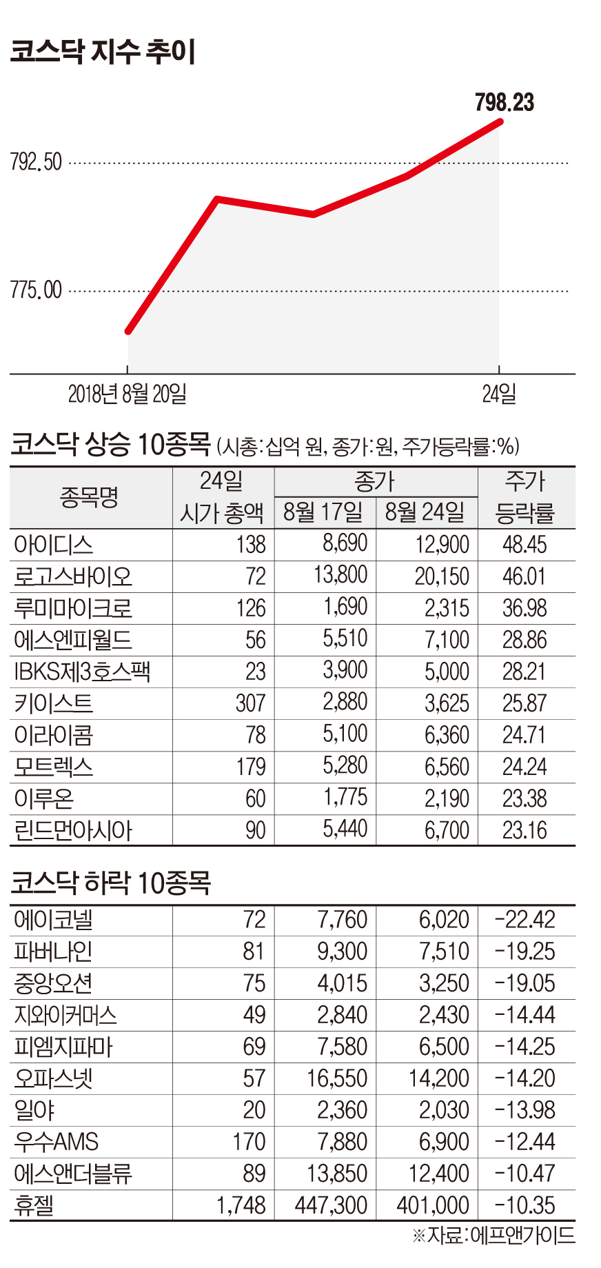 지난주(8월 20~24일) 코스닥지수는 전주(772.30)보다 25.93포인트(3.35%) 상승한 798.23로 거래를 마쳤다. 외국인과 기관이 각각 822억 원, 1217억 원 순매수한 반면, 개인은 홀로 1642억 원을 팔았다. 외국인과 기관의 매수에 힘입어 코스닥은 다시 800선 회복을 바라보게 됐다.