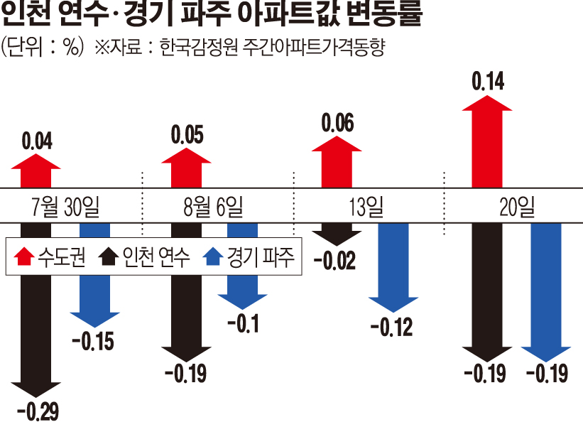 28일 한국감정원에 따르면 송도가 속한 인천 연수구와 경기도 파주시의 20일 기준 아파트매매가격은 각각 전주 대비 0.19% 하락해 수도권서 가장 큰 낙폭을 기록했다. 이주 수도권이 0.14% 오르며 상승 폭을 전주(0.06%) 보다 2배 키운 것과 비교하면 눈에 띄는 하락세다.