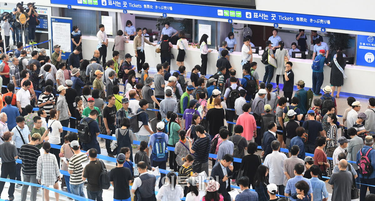 추석 연휴 열차승차권 예매가 시작된 28일 오전 서울역에서 시민들이 귀성·귀경 열차표를 예매하기 위해 길게 줄지어 차례를 기다리고 있다. KTX와 무궁화호 등 코레일 이용객은 28일 경부·경전·동해·충북선, 29일에는 호남·전라·장항·중앙선 등의 승차권을 살 수 있다. 한편, SRT는 코레일과 별도로 다음 달 4일과 5일에 예매가 가능하다. 오승현 기자 story@