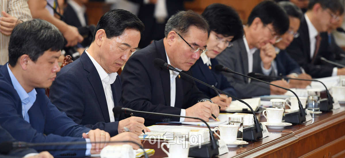 김상곤 사회부총리 겸 교육부장관을 비롯한 참석자들이 28일 오전 서울 세종로 정부서울청사에서 열린 '국정현안점검조정회의'에서 이낙연 국무총리의 발언을 메모하고 있다. 이 총리를 비롯한 참석자들은 이날 회의에서 최근 고용 문제에 관해 집중적으로 의견을 나눴다. 오승현 기자 story@